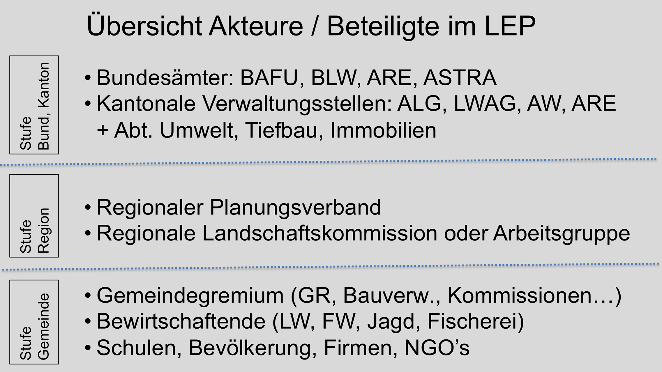 Auf der Umsetzungsebene sind vor allem die Gemeinden, Gemeinderäte, Bauverwaltung, Landschaftskommissionen, Schulen, Landwirte, Förster, Jäger, Fischer, NGOs, Grundeigentümer, Firmen und Private die Hauptakteure. Auf öffentlichen Flächen sind auch der Bund und Kanton betroffen.