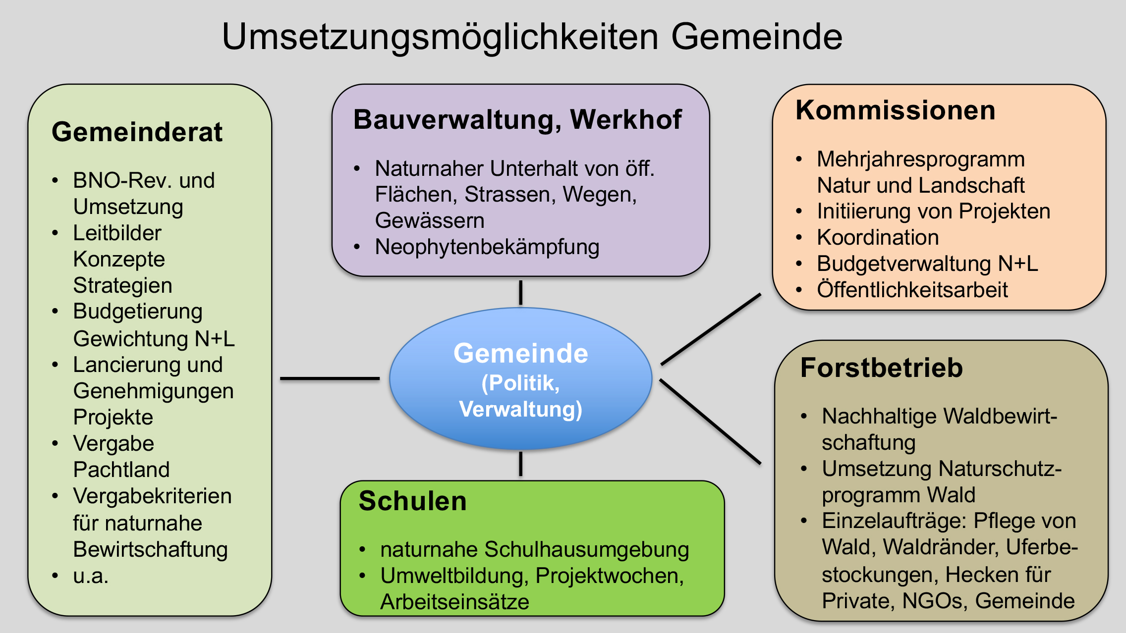 Die meisten Massnahmen und Projekte werden auf Stufe Gemeinde umgesetzt. Dabei gilt es zu unterscheiden, ob die Projekte durch die Gemeinde selbst oder durch externe Akteure initiiert werden (z.B. Kanton, NGOs, Private).