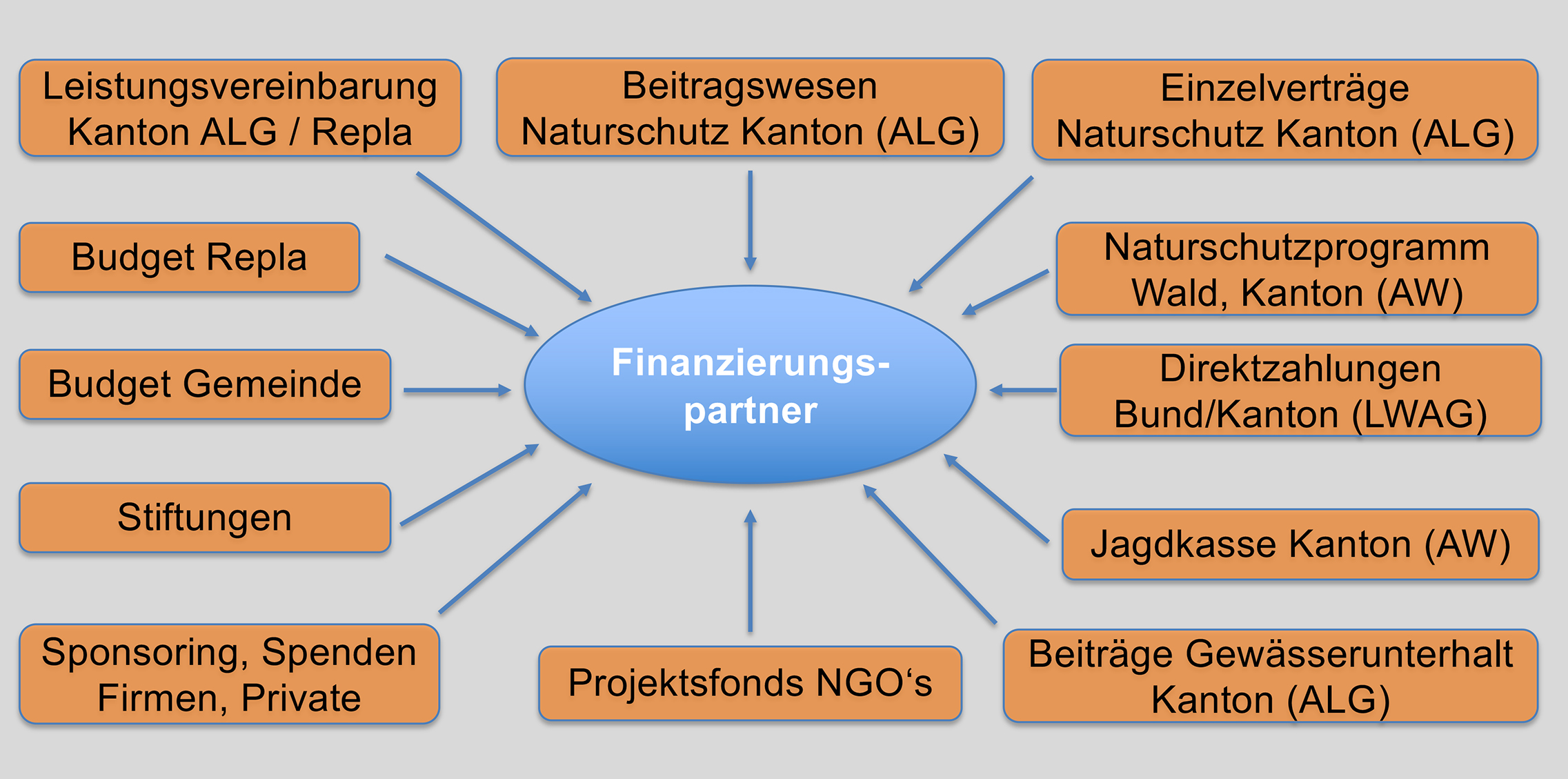 Für die Finanzierung von Massnahmen und Projekten im Bereich Natur und Landschaft besteht eine Vielzahl von Finanzierungsmöglichkeiten. Die folgende Zusammenstellung zeigt eine Übersicht zu den wichtigsten Partnern.
