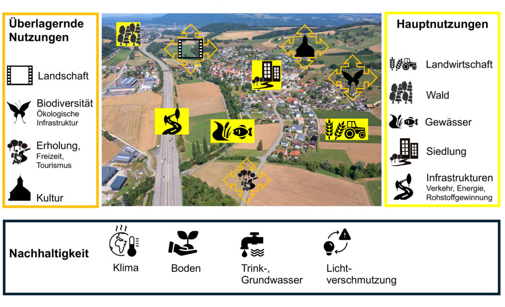 • Die überlagernden Nutzungen (Themen) hingegen können auf verschiedenen Flächentypen stattfinden (z.B. Naturschutz auf Landwirtschaftsflächen, im Wald oder Siedlungsgebiet).
